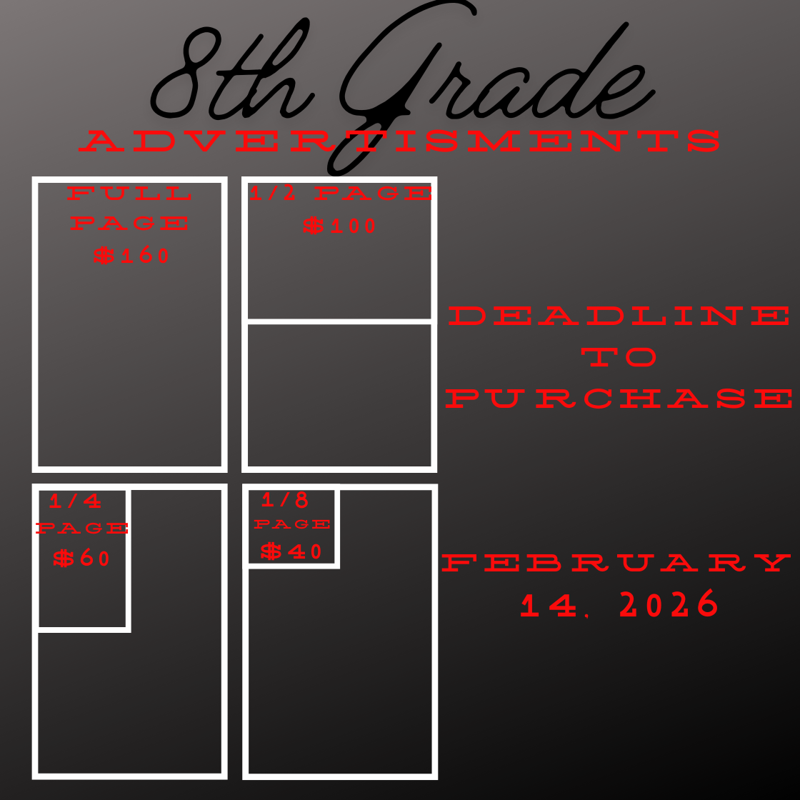 Purchase your 8th Grade Yearbook Ad today! Deadline is February 14, 2026!! https://yearbookordercenter.com/product/yearbook_ads
