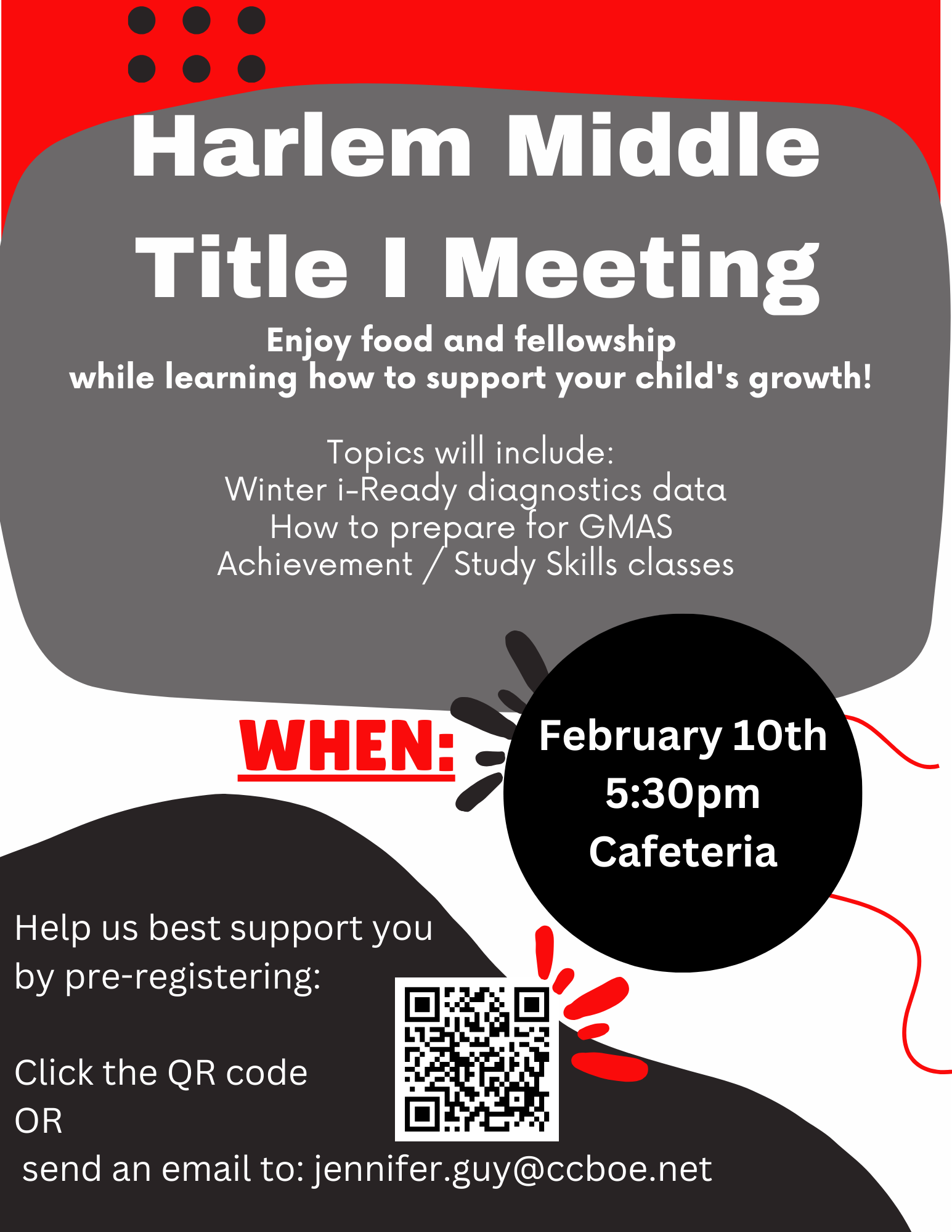 Title I Meeting Mark your calendar for our Title I Meeting - February 10th @ 5:30. Pre-Register here by completing this form linked here Title I Meeting Pre-Register Form